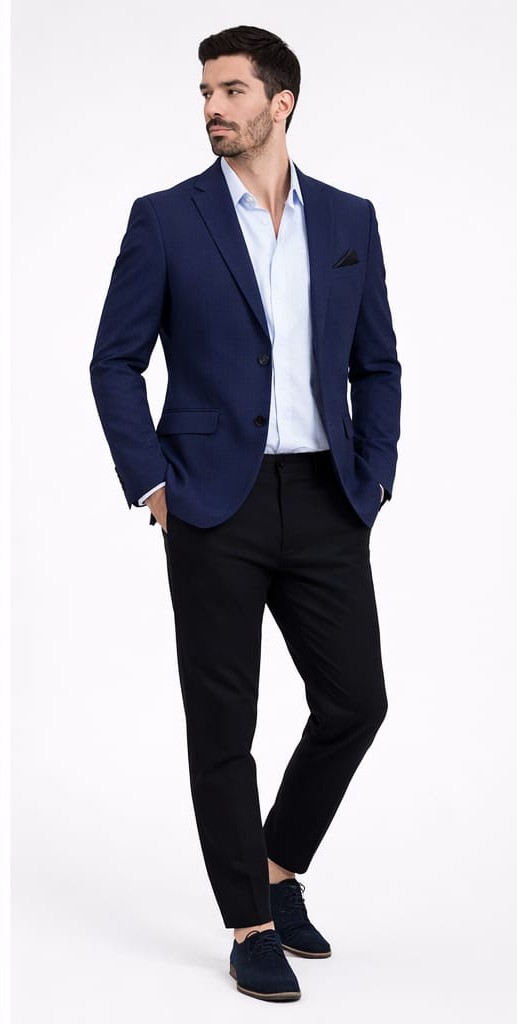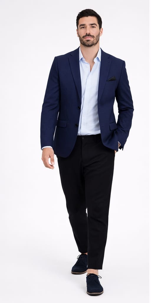Este tipo de americana es muy versátil. Puedes usarla para un evento formal con una corbata o adoptar un estilo business casual dejando la camisa abierta sin corbata, tal como aparece en la imagen.