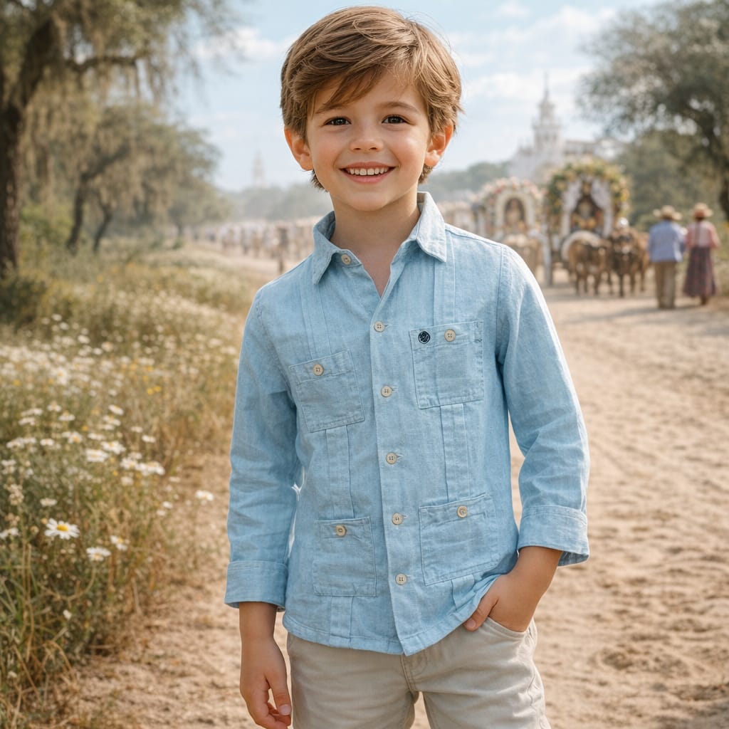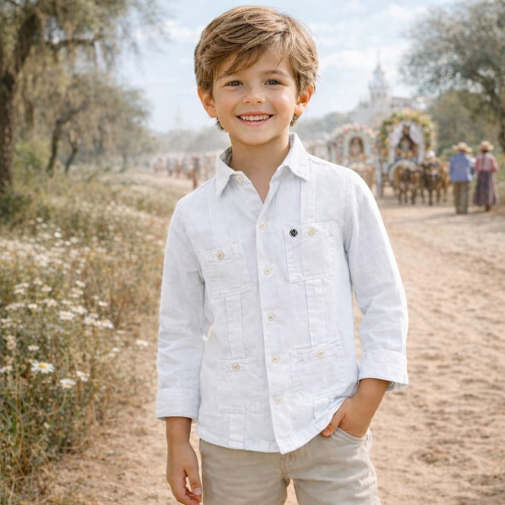 Este modelo en particular es una Guayabera para Niño confeccionada frecuentemente en una mezcla de lino y algodón para mantener la frescura.