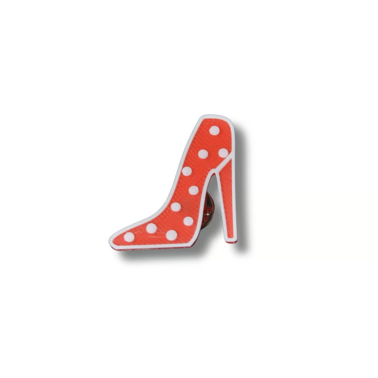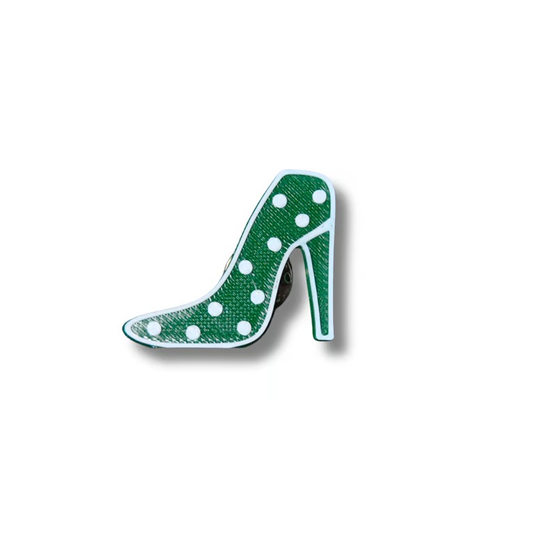 - Diseño: Cada pin representa un zapato de tacón clásico con punta fina y tacón de aguja. El acabado es de esmalte de colores con motas contrastantes.