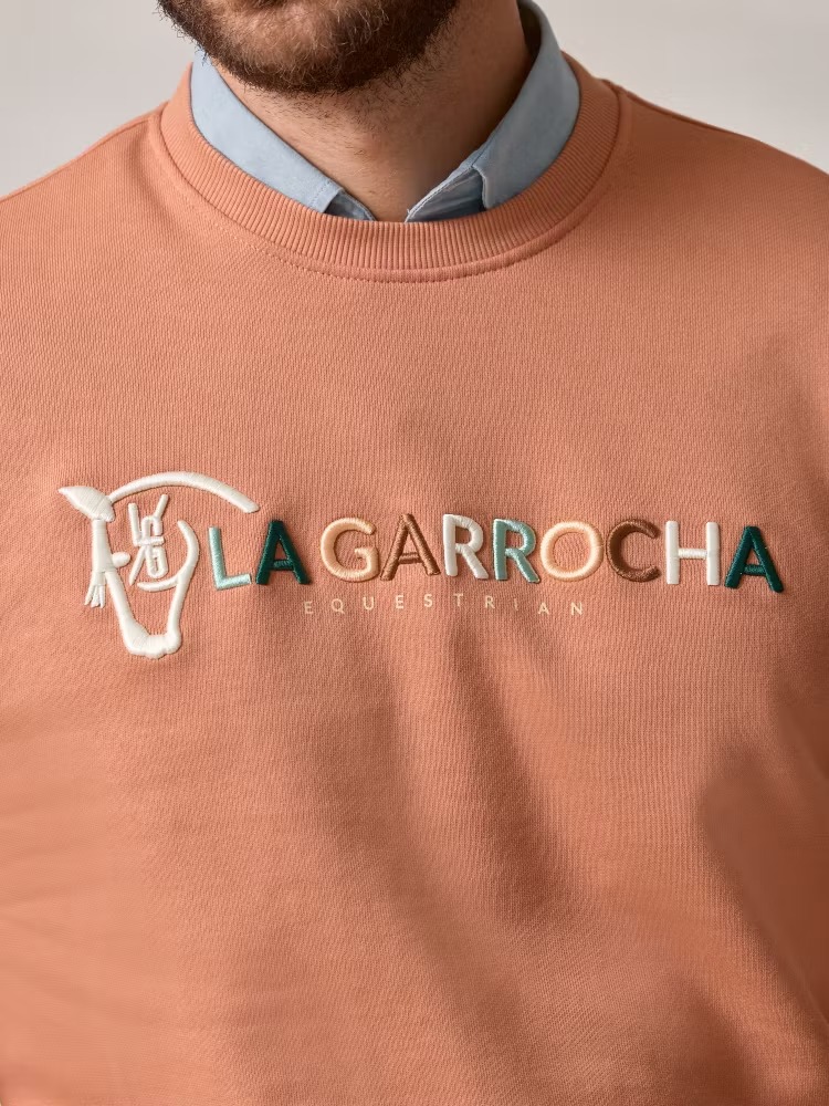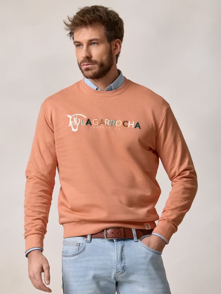 Sudadera Equestrian lisa en color salmón confeccionada en tejido 100% algodón. Corte casual, cuello redondo, manga larga. Bordado 3D de nuestra marca y print en el frontal. Etiqueta con nuestro caballo en elástico inferior.