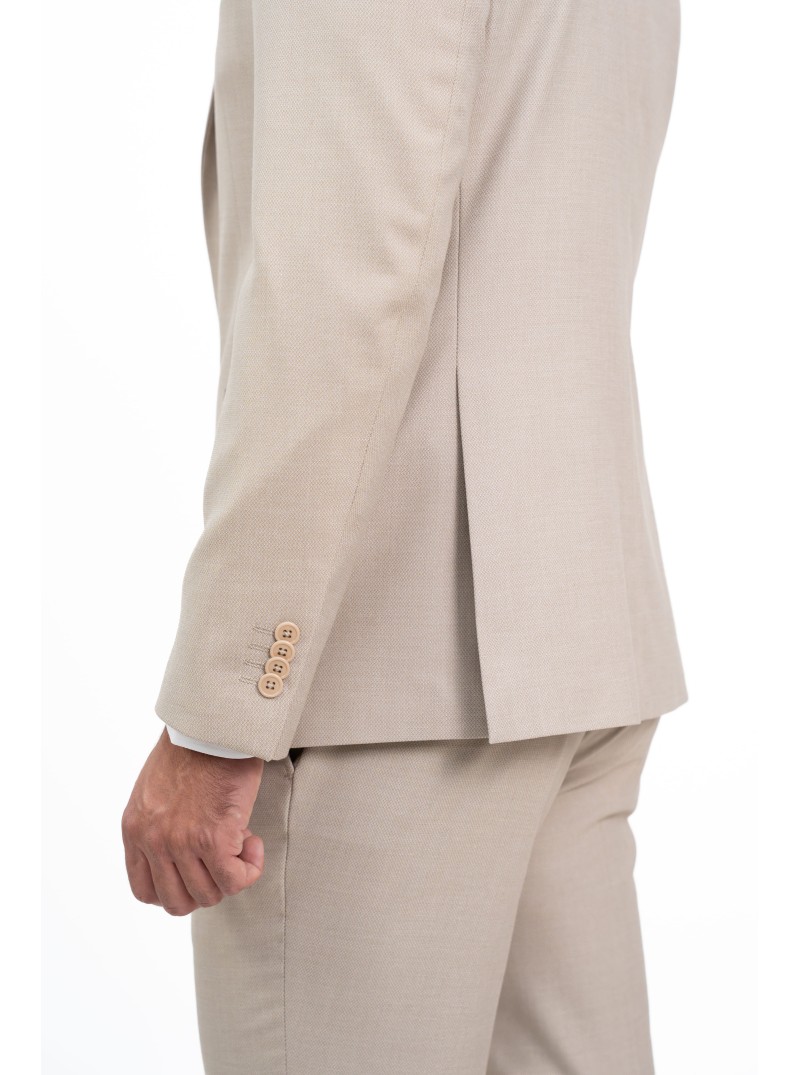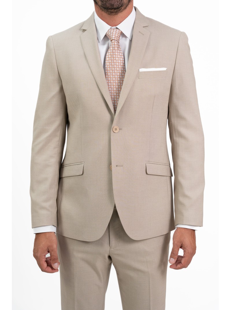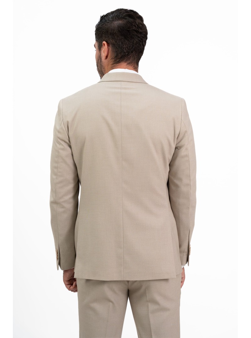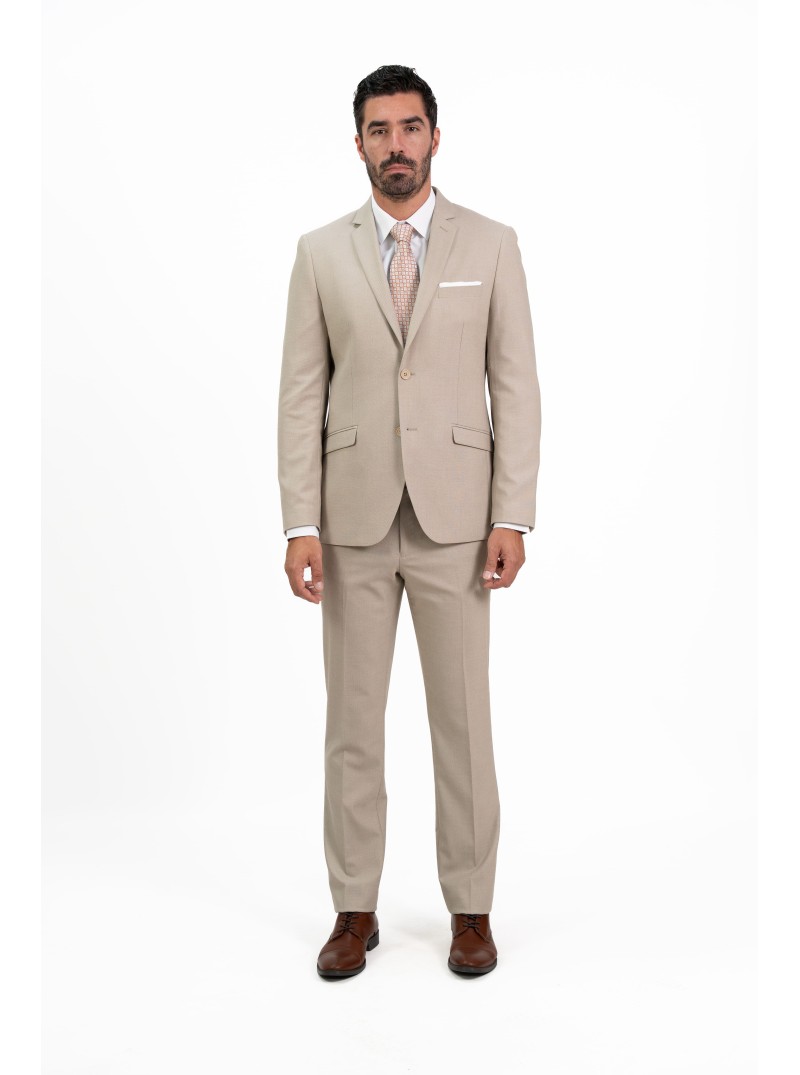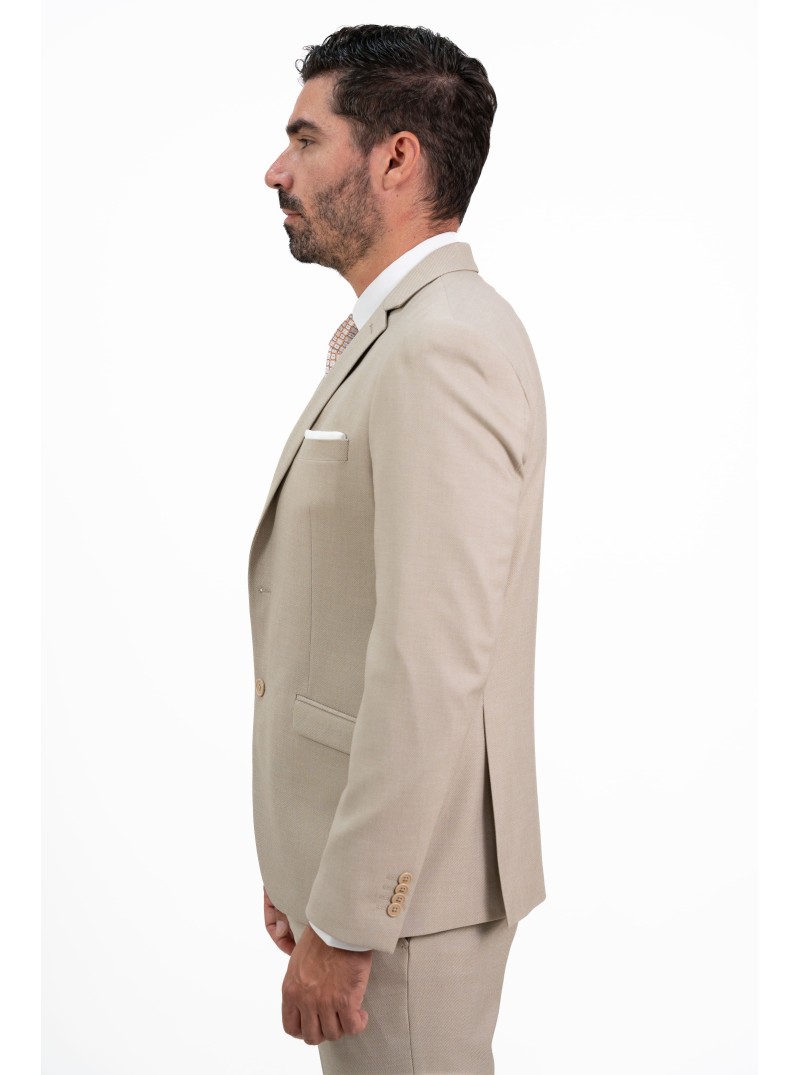 Este traje de caballero en color beige arena es la elección perfecta para quienes buscan un equilibrio entre la elegancia clásica y el diseño contemporáneo. Su tejido se distingue por un sofisticado microdibujo (o microestructura), que aporta una textura visual rica y moderna, ideal para destacar con sobriedad en eventos de día, ceremonias o entornos profesionales de alto nivel.