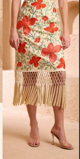 - Acabado en Flecos: El bajo está rematado con una espectacular hilera de flecos largos, unidos mediante un delicado trabajo de rejilla entretejida a mano. Este detalle aporta un movimiento hipnótico al caminar.