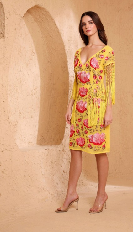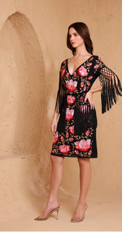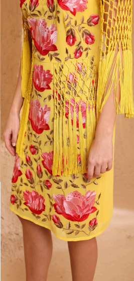 Este vestido de estilo flamenco, caracterizado por su bordado floral tipo mantón de Manila y flecos.