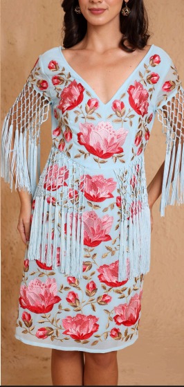 Es una prenda popular para eventos como ferias o bodas, confeccionada habitualmente en tejido de gasa o lycra de algodón, con bordados en tonos coral y flecos largos que aportan movimiento.