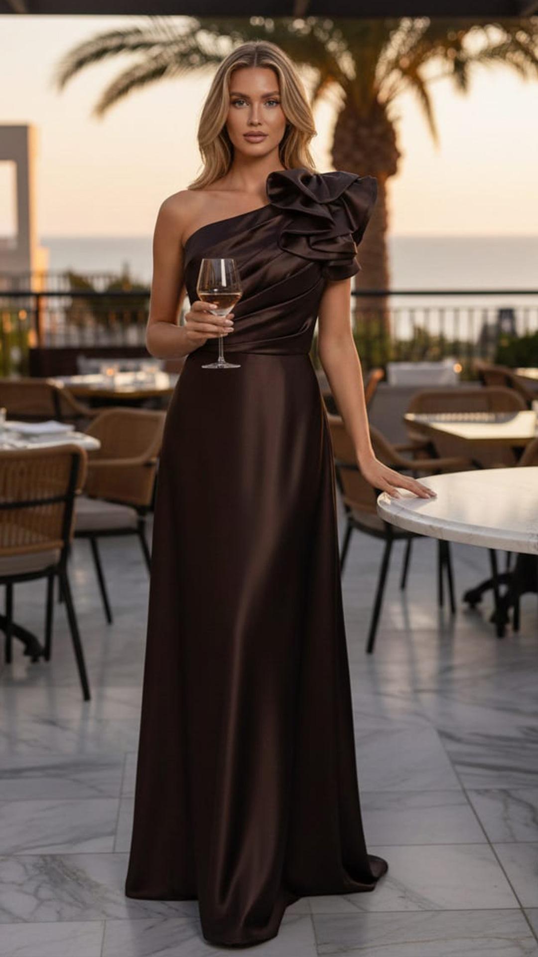 Este elegante vestido largo es un modelo de satén en color marrón chocolate que destaca por su diseño asimétrico de un solo hombro. El detalle principal es un llamativo volante en cascada o rosetón en el hombro, que aporta un toque sofisticado y moderno.